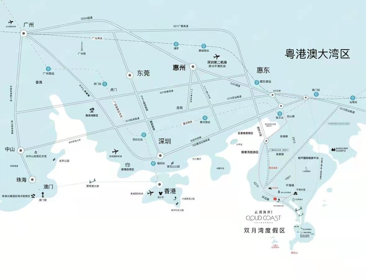 賣點4:灣區內唯一一個帶走溫泉的海景項目,定位全時山海自然棲息地,打造融于自然又舒適的建筑產品,成為片區內新的標桿項目。項目位于粵港澳大灣區惠東縣稔平半島雙月灣旅游度假區,處于片區最后未開發的自然海灘區域,海水以及海灘質量極佳。也被稱為深圳東最美度假區,雙月灣位于珠三角的黃金度假圈之內,4條高速,1個機場,2條高鐵的立體交通網。