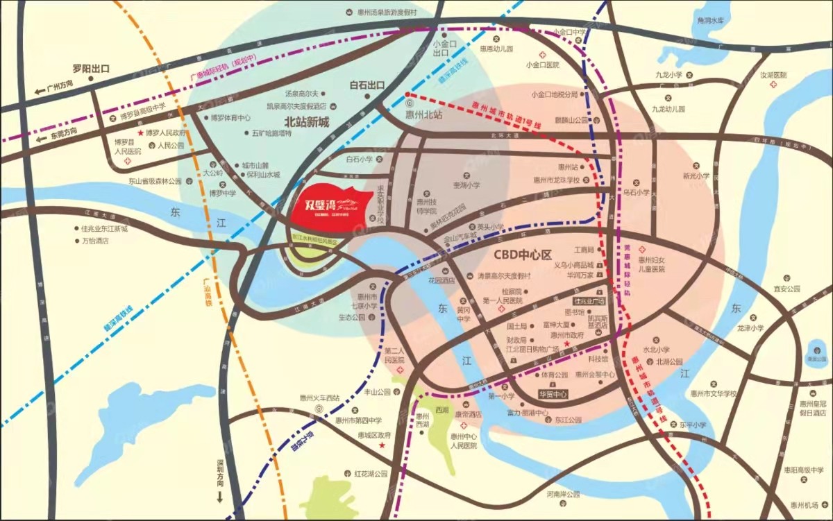 項目二期旁邊一條長風路6分鐘可到達白石互通新開高速入口,預計于今年年底通車,通車后,30分鐘廣州,深圳,東莞半小時生活圈,8分鐘惠州北站,于2021年9月通車,贛深高鐵,廣汕高鐵,惠州北站將是珠三角第二大交通樞紐站,門口有50路公交車直達華茂,第一人民醫院,市政府等購物中心,行政中心與醫療機構。第三東江大橋年底通車,通車后10分鐘可到達西湖風景區。